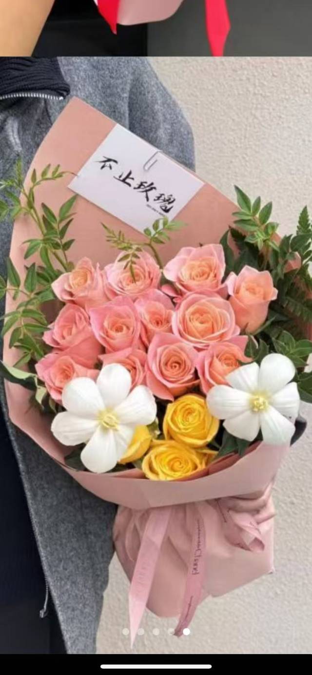花材信息:12支朱小姐玫瑰3支黄玫瑰2支白色郁金香花束,按图包