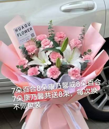 花材信息:7朵百合8朵康乃馨,每次换不同包纸(图片仅供参考,或8朵百合7朵康乃馨也行)