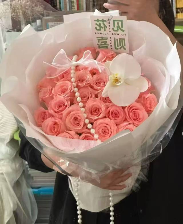 35朵粉玫瑰1朵蝴蝶兰花束,按图做
