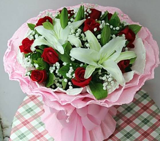 11红玫2百合,如图包装,有卡片,尽快送到,麻烦包精致一点 |