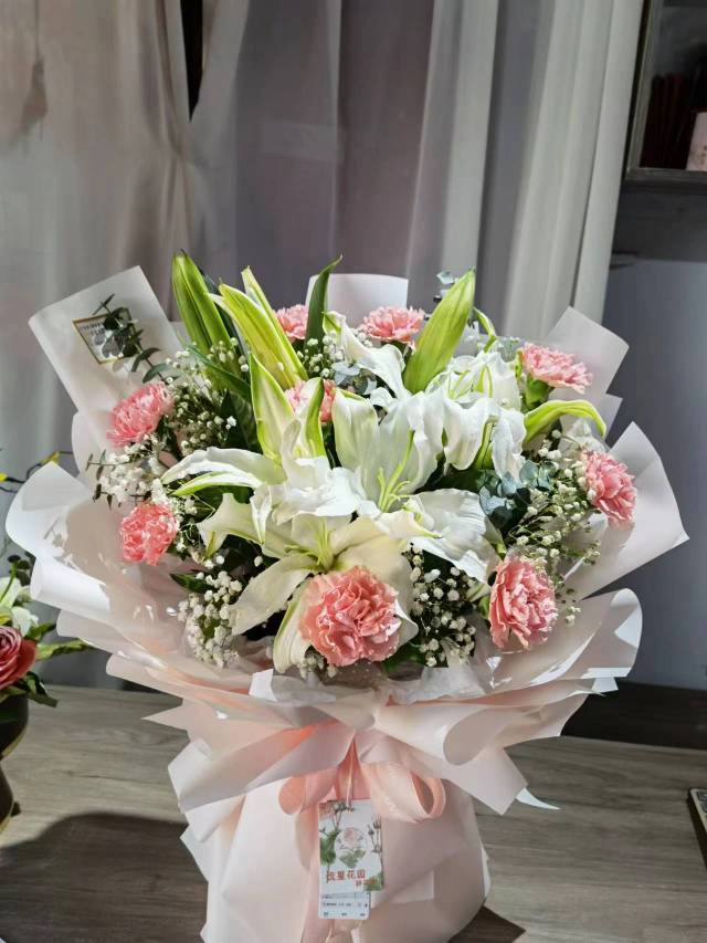 11支粉康乃馨2支白百合满天星花束,如图
