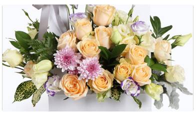 19朵香槟玫瑰+5香槟紫色洋桔梗混搭手提花篮 一个(紫边洋桔梗换绿洋桔梗和波浪粉洋桔梗混搭),有卡片 ,按时送达。 |