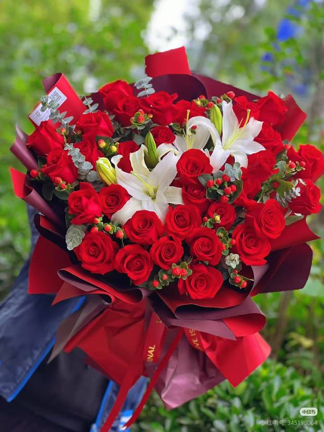 30朵红玫瑰+2支多头白百合花束,红色包装纸 |