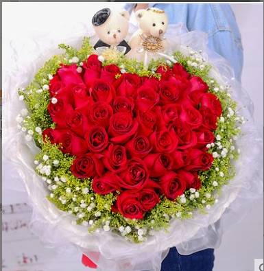 精选33朵红玫瑰搭配黄英 满天星,珍珠纱❤型包装,2支小熊,1个花瓶 |