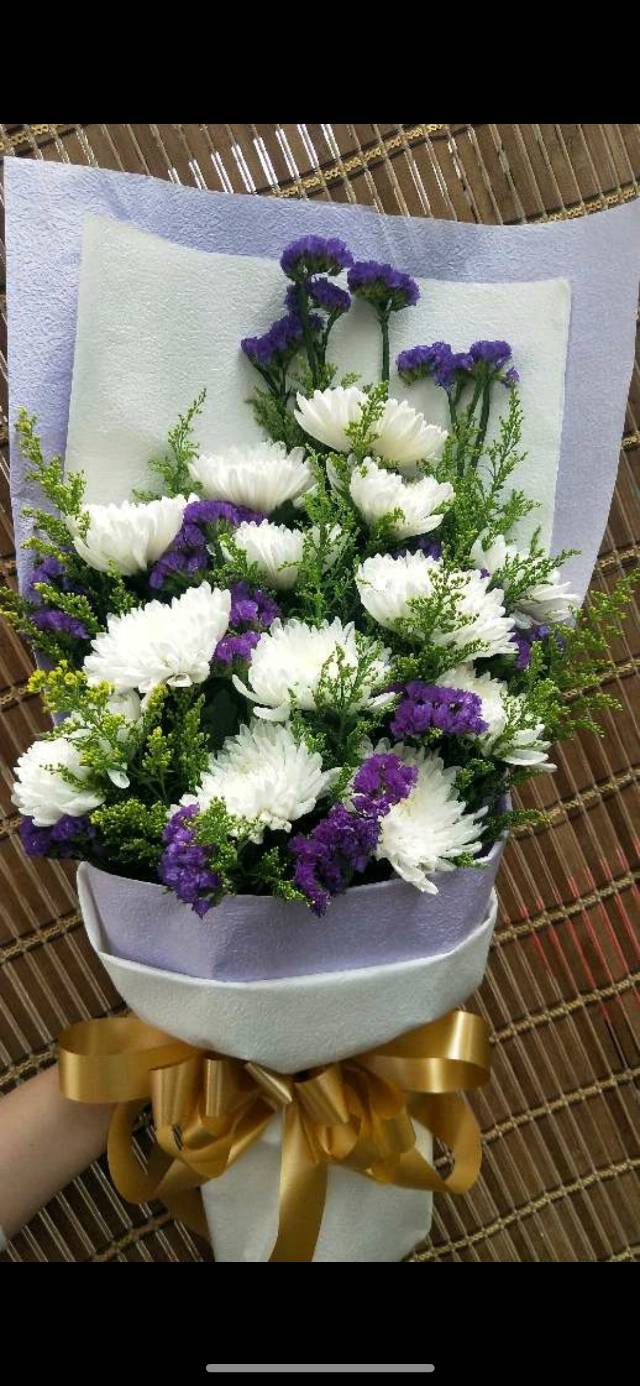 13朵白菊花搭配紫色勿忘我 黄英 白色 蓝色包装 金色丝带 |