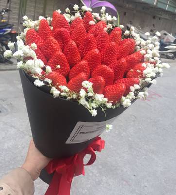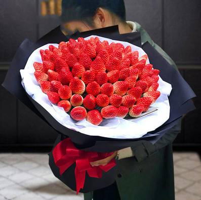 99颗草莓 里层白色雪梨纸 外层黑色牛皮纸 圆形包装 红色扎带 |