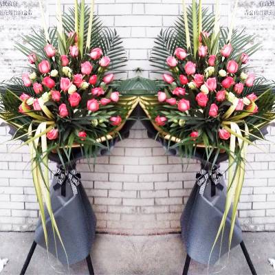 2个三角架高档花篮,每个花篮花材:35朵粉玫瑰+洋桔梗(多谢些)搭配+散尾叶+剑叶搭配丰满,下面用灰色纸包裹内村黄色牛皮纸,纸要包大些,按图制作,务必保证花材,新鲜,如图效果,以免客户投诉 |