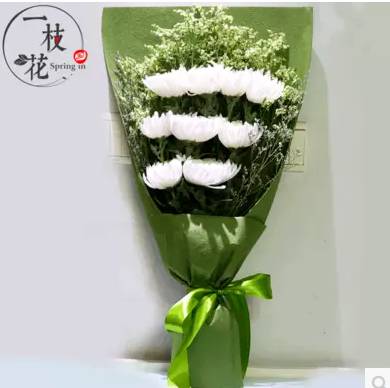 9朵白菊花 搭配水晶草 绿色包装纸 |