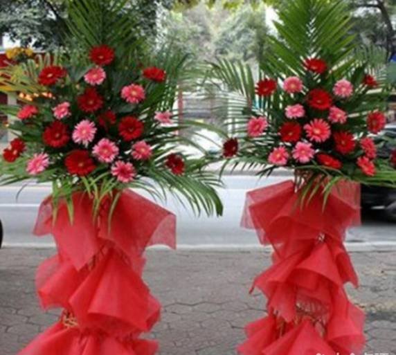 大红大紫开业花篮一对 如图 花篮要做得好看 |