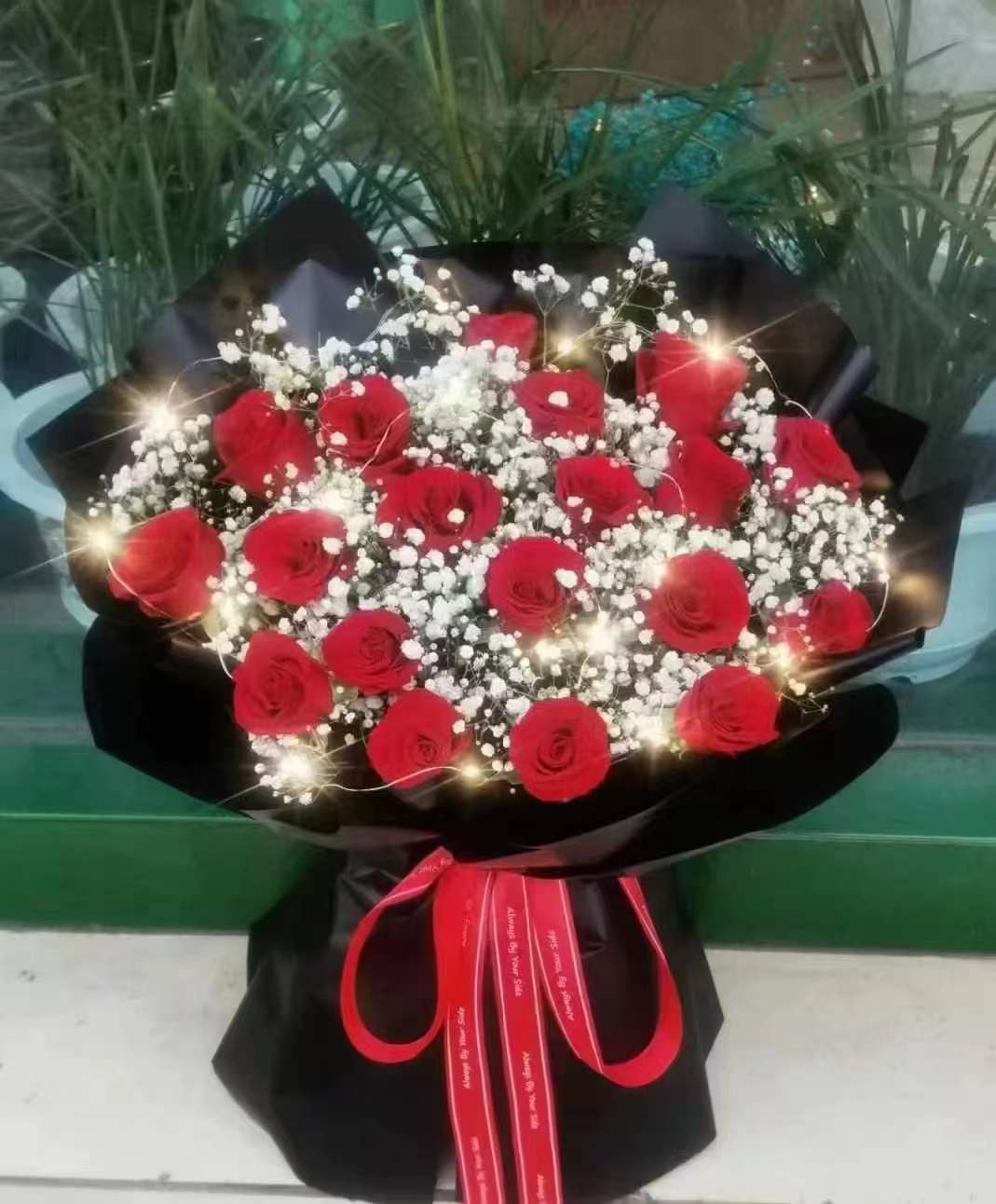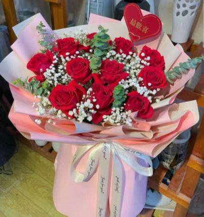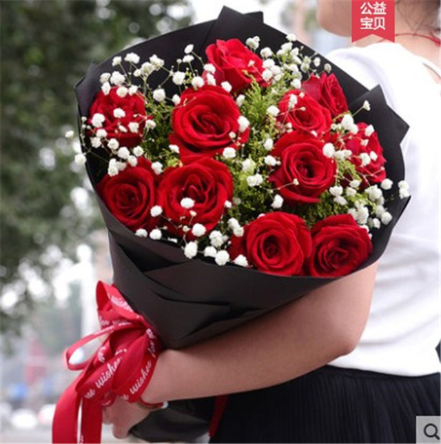 11支红玫瑰满天星花束,粉色包装纸