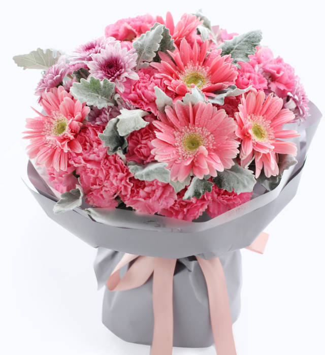 嫣然.粉色康乃馨19支.粉色夫郎花5支.紫色雏菊3支.枝子叶围绕